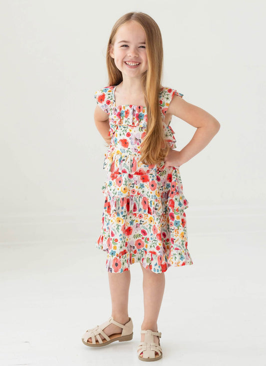 Denim Embroidered Ruffle Romper (Blue Denim)