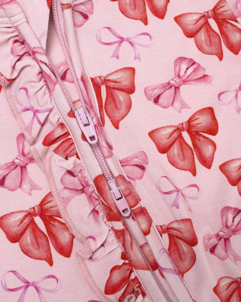 Our signature viscose from bamboo ruffled footie will be your favorite go-to. With a ruffle down the front and ruffles on their bottom, our footie can be adorable jammies or your babe's outfit for the day! Add a matching headband and you're off. Our double zipper option makes diaper changes simple at all times of the day (and night). Zip from top or bottom without undressing your babe. Footie grips in Lev's signature hearts, cuffs on newborn and 0-3m to avoid scratching their sweet faces and our snug fit will ensure the best dressed and most snuggly babe ever!