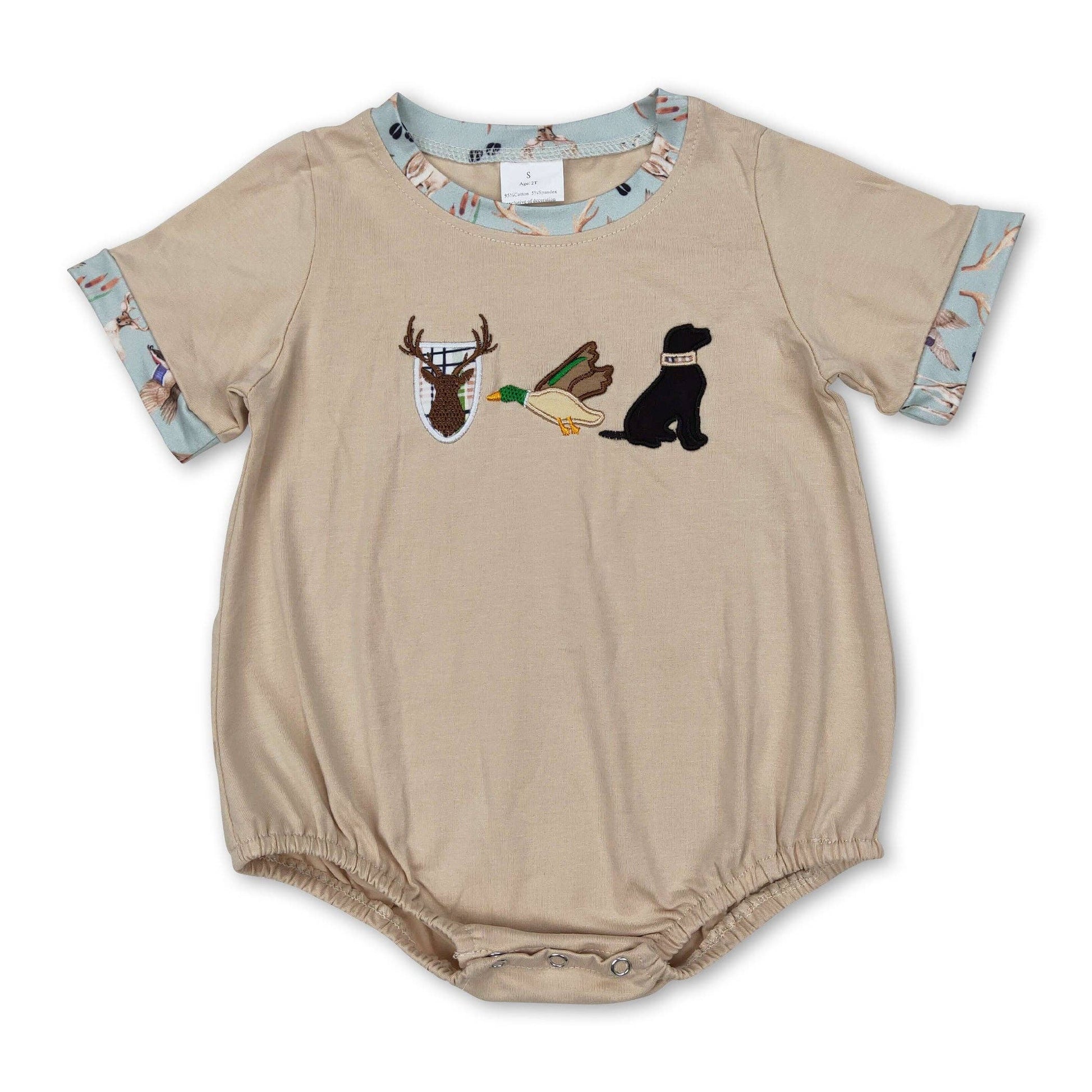 Adorable romper featuring charming embroidered hunting scenes with deer, duck, and dog motifs. Perfect for little ones who love outdoor adventures and wildlife themes. Soft, comfortable fabric makes it ideal for playtime or casual outings. This sweet one-piece design combines style with practicality, offering easy dressing for active toddlers. A delightful choice for parents seeking unique, nature-inspired clothing that celebrates the great outdoors.