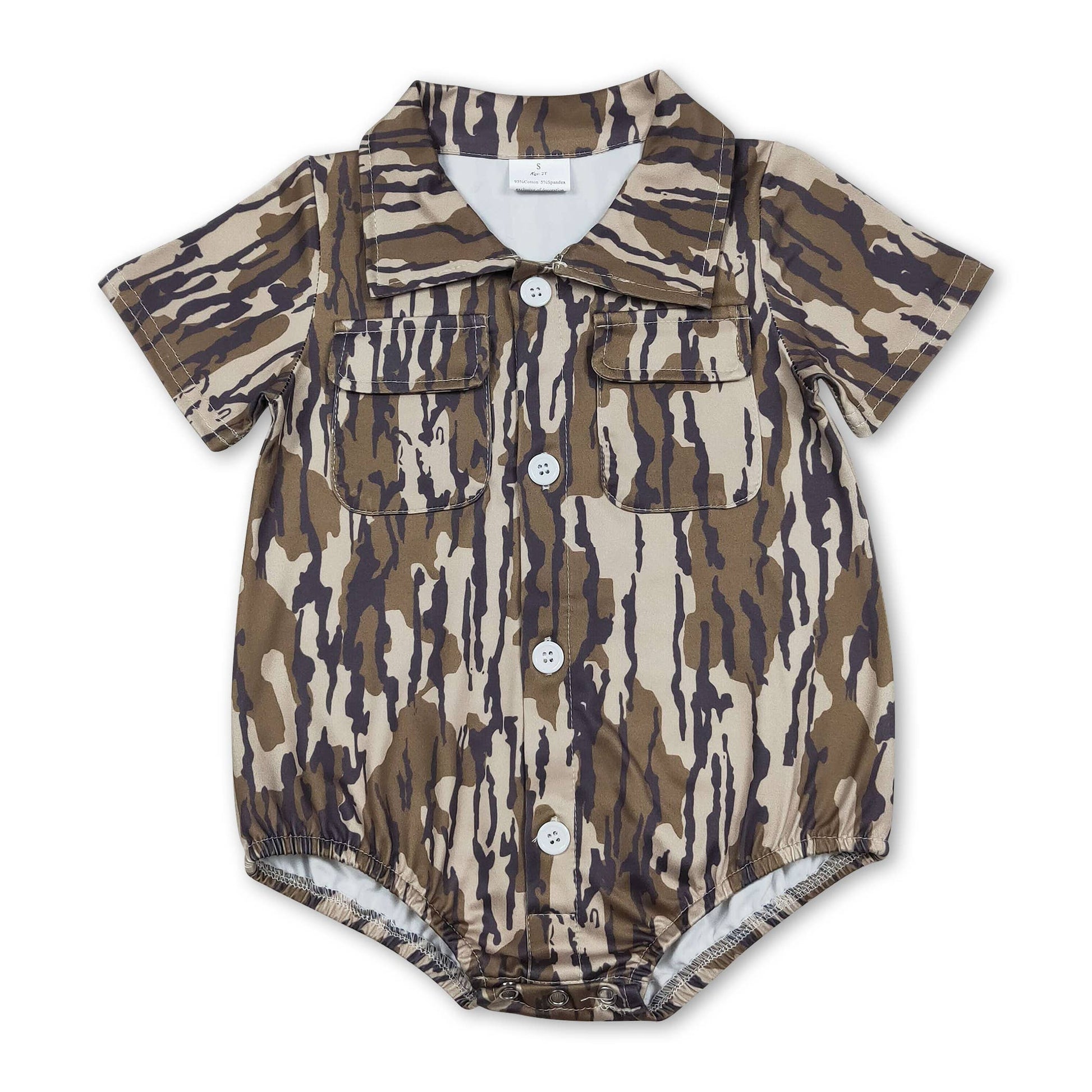 Dress your little one in style with this Olive Camo Button Down Romper. Featuring a classic camouflage print in earthy olive tones, this one-piece romper combines comfort with contemporary flair. The button-down front makes diaper changes and dressing effortless, while the relaxed fit allows plenty of room for movement and play. Perfect for casual outings or everyday wear, this versatile piece pairs easily with sneakers or soft shoes. A wardrobe essential that keeps your baby boy looking sharp and feeling comfortable all day long.